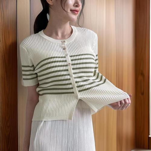 [신상오픈런]여성 여리핏 스트라이프 라운드넥 버튼 골지 반팔 니트 가디건 (32776727)