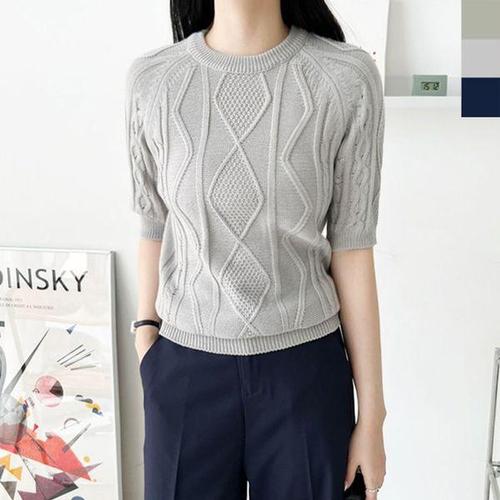 [에이치플러스몰]여성 라운드 꽈배기 반팔 니트 1P 데일리 크롭 티셔츠