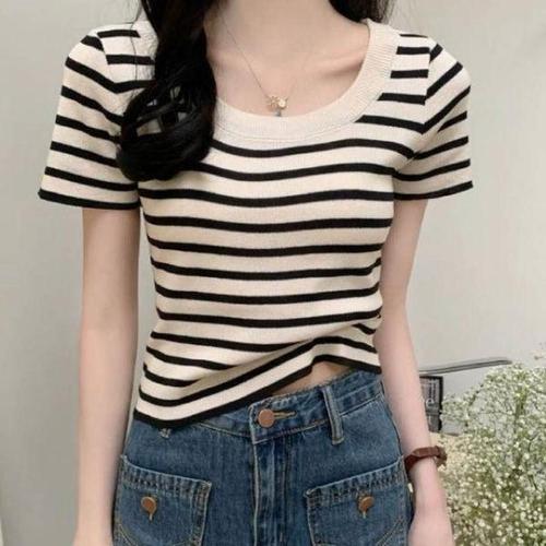 Vezri 여성 여름 V넥 크롭 니트 티셔츠 캐주얼 스트라이프 반팔