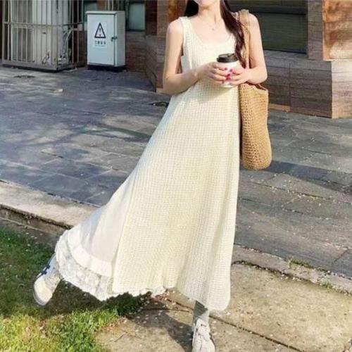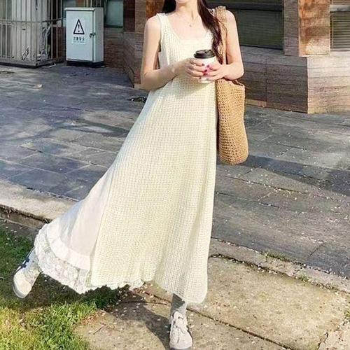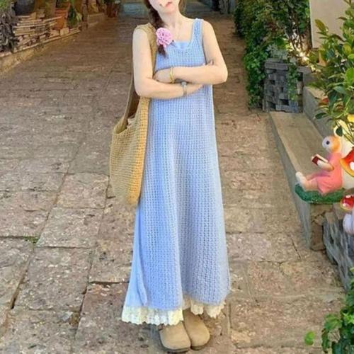 [에이치플러스몰]여름 투피스 민소매 펀칭 니트 치마 롱 원피스 세트