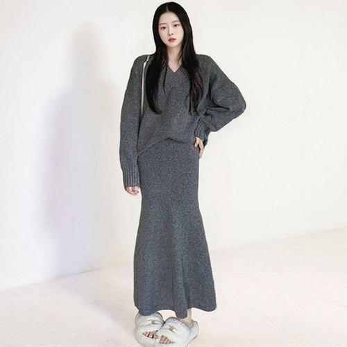 미즈큐즈 / 55-99까지 브이넥 니트 스커트 투피스 상하세트