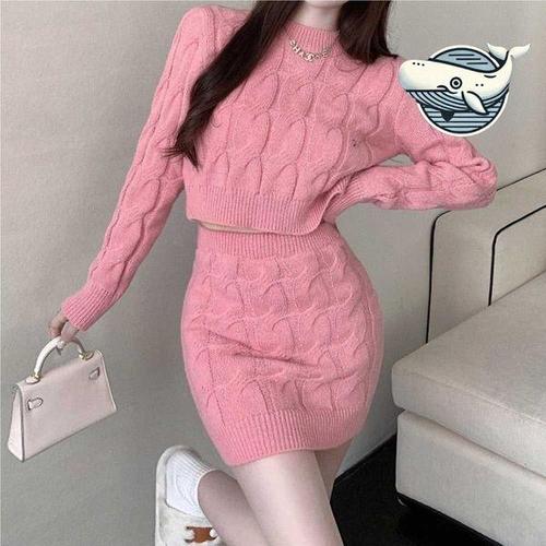 [에이치플러스몰]러블리 핑크 니트 세트 크롭탑 스커트 캐주얼