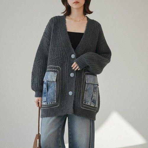 [핑크엘리제]데님패치 루즈핏 와플 스웨터 포리텐니트가디건