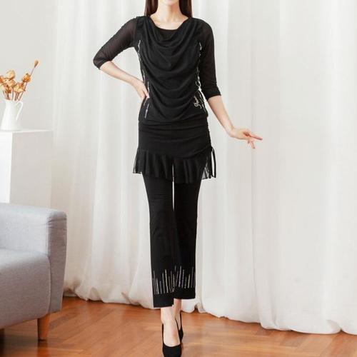 [까르죠아]쉬폰 밑단 스커트 빛줄기 보석 랩 바지 스포츠 댄스복 여성 라인 빅사이즈 50대 60대