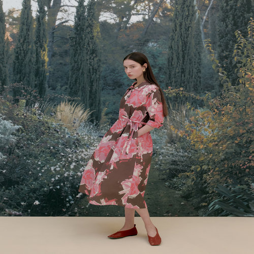 닥스 여성 다크브라운 플라워 프린트 스트랩 카라 원피스 (DLDR6B306W3)