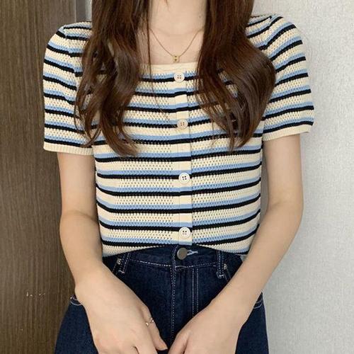[에이치플러스몰]카라 스트라이프 여름 니트 반팔티 단추포인트 베이직