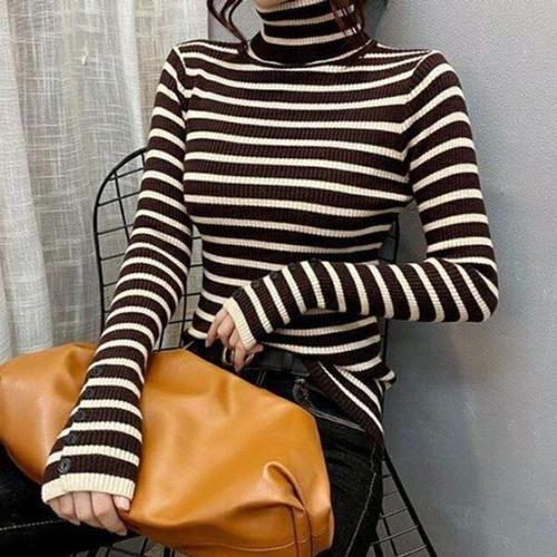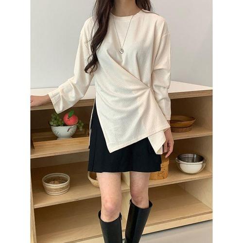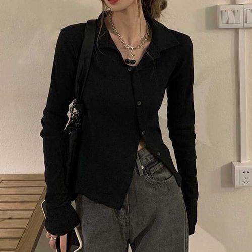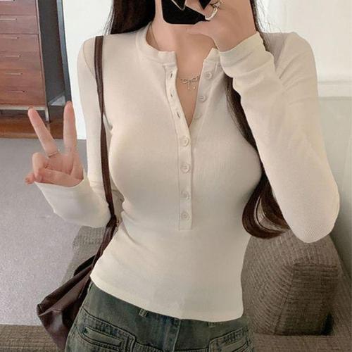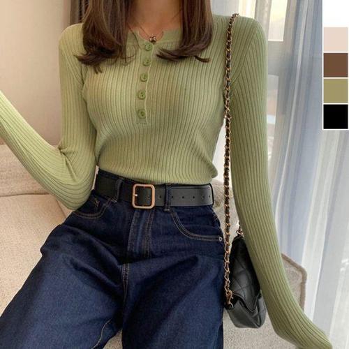 슬림한 긴팔 골지 패션 라운드넥 몸매라인 강조 간절기 데일리 캐주얼 티셔츠 가슴 단추