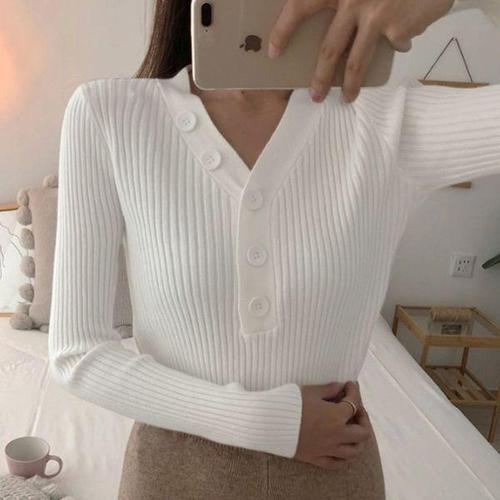 여성 이쁜 샤방샤방 브이넥 단추 골지 니트 티셔츠