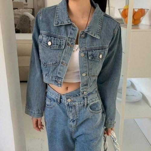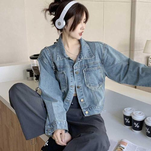 스트리트 캐주얼 루즈 버튼 스플릿 짧은 데님 자켓 여성 패션 봄 가을 2025 스탠드 칼라 긴 소매 진 자켓