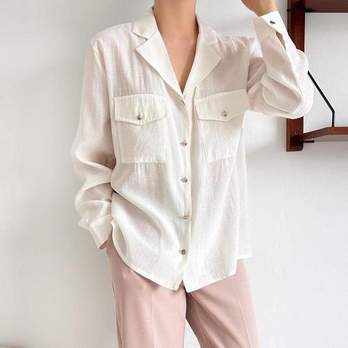 [다잇템_패션]여성 U넥 분홍 단추 더블포켓 미색 블라우스