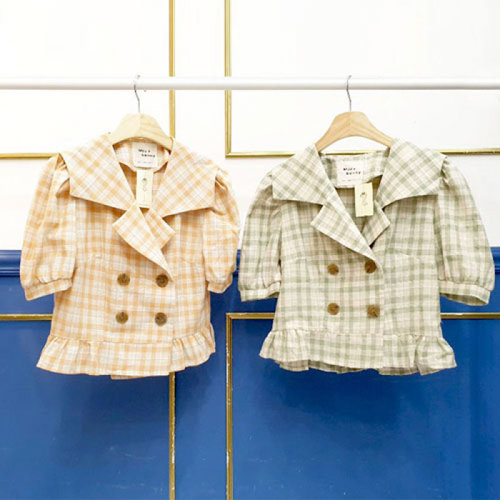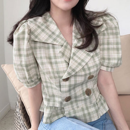 슈팅스타 / 체크 카라 더블버튼 반팔 숏 블라우스