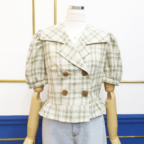 슈팅스타 / 체크카라 더블버튼 숏 블라우스 그린
