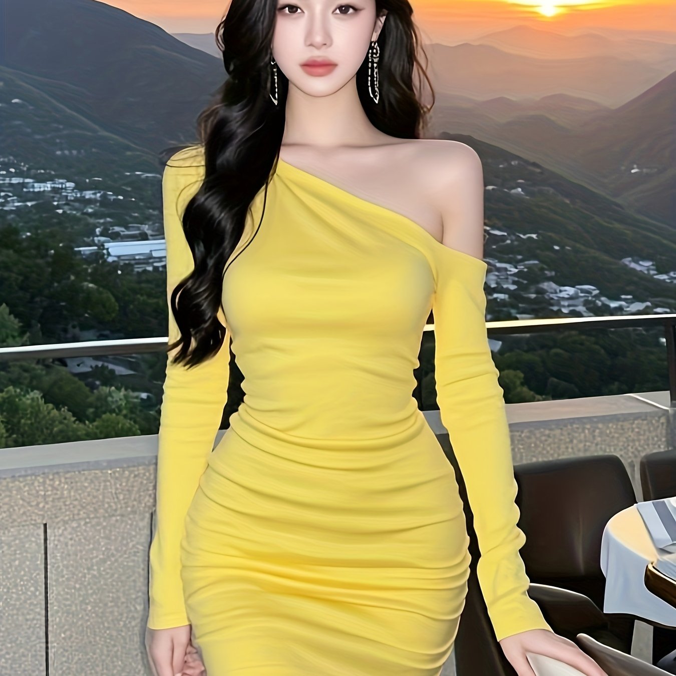TEMU 여성 섹시 오프숄더 옐로우 드레스 - 포멀 & 캐주얼 파티, 데이트 나이트룩 - 롱 슬리브 바디콘 파티 드레스 - 올 시즌 시크 이브닝 가운
