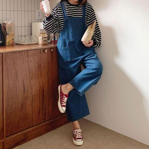 엘럽 여자 점프슈트 가을 캐주얼 빅사이즈 핏 데님 9부 멜빵바지 힛템