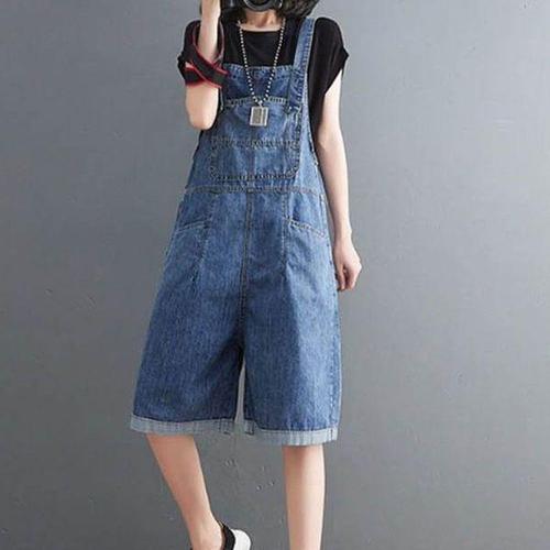 WANGBAIWAN 여성 캐주얼 9부 배기 데님 멜빵바지 싱글 버튼 빅사이즈 포켓 가벼운 롤업 청점프수트 S51436