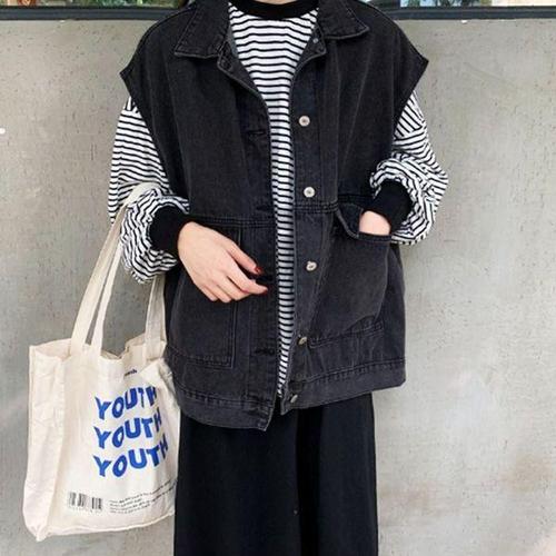 빈티지 블랙 데님 베스트 스트릿 진조끼 아우터 (WFK578P)