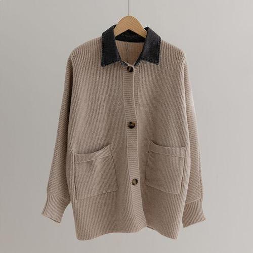 네모엔룩 배색청카라 여성용 데님배색 앞가슴 포켓장식 기본핏 캐주얼 레이어드 자켓형 카라넥 도톰 니트 가디건