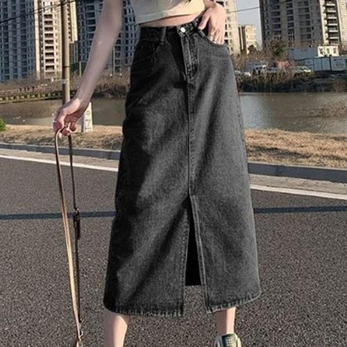 BLACK K7 여성 빈티지 캐주얼 앞트임 데님 롱스커트 빅사이즈 패션 청 롱스커트