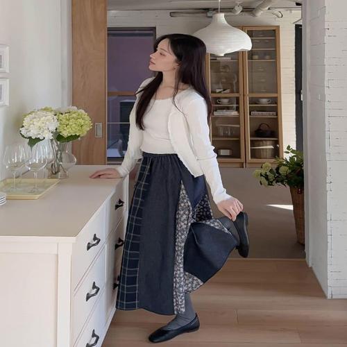 [엘루이즈][엘루이즈] [모리걸/빈티지] 나리아 패치워크 데님 믹스 플레어 밴딩 롱스커트