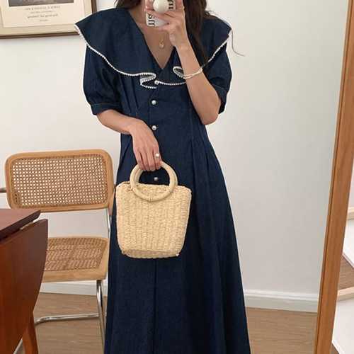 빼빼 여성용 버튼 딥 카라넥 언발 프릴 데님 원피스