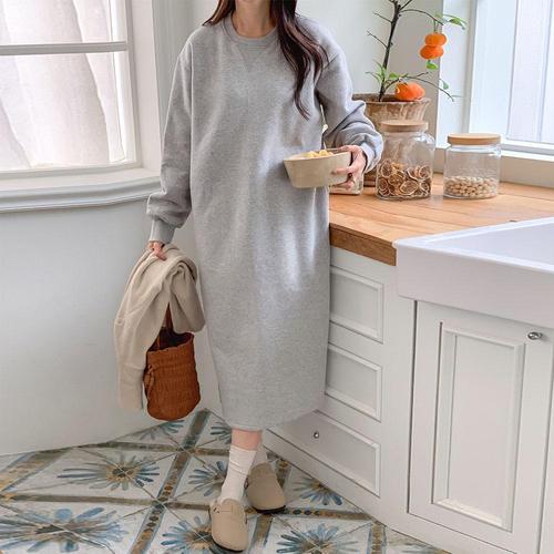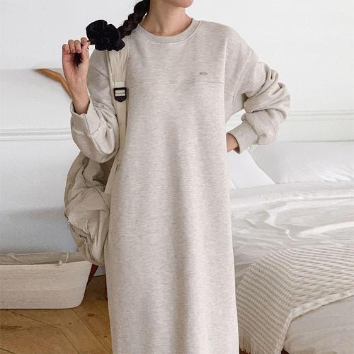[문에이블]문에이블 여자 여성 겨울 루즈핏 빅사이즈 라운드넥 베이직 데일리 편한 기모 긴팔 롱 원피스