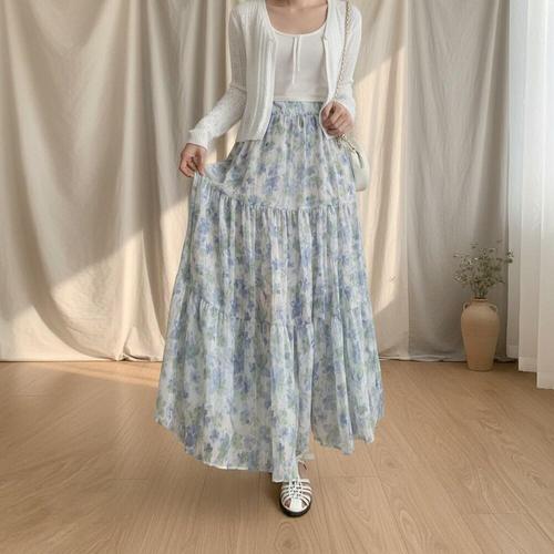 [옷자락]여성용 하늘빛 플라워 롱 데일리 바캉스 스커트