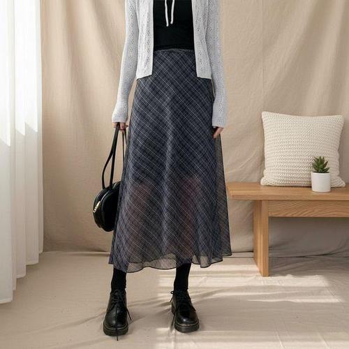 [옷자락] 여성 봄 데일리 체크 밴딩 롱스커트