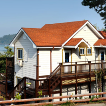피라밋형 방갈로 와 유럽풍 목조주택 야외테라스 바닷가 아름다운 석양노을 조용한휴식