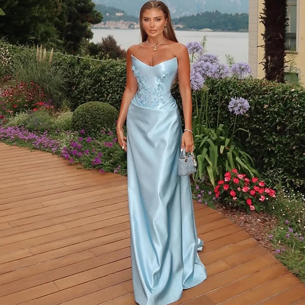 패션 새틴 이브닝 드레스, 섬세한 꽃무늬 스트랩리스 프롬 드레스, 우아한 아플리케, 맞춤 제작 특별한 날 드레스