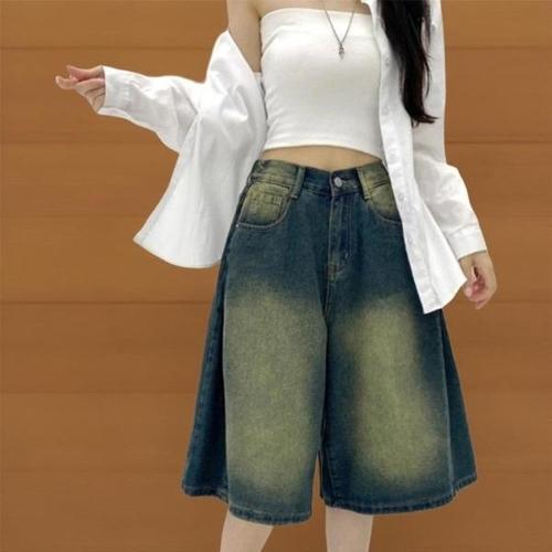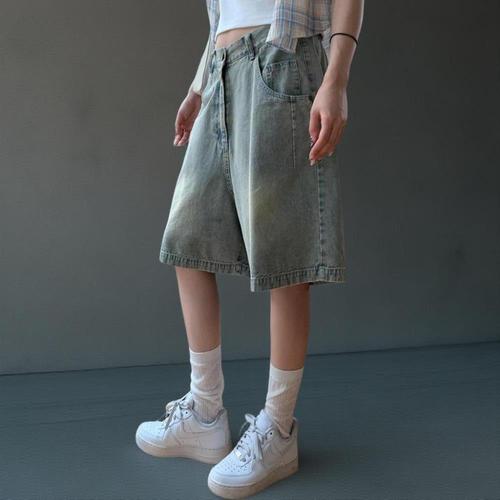 [신상오픈런]|CSP8C29|남녀 공용 핀턱 와이드 워싱 청반바지 뒷밴딩 버뮤다_21887075_597559