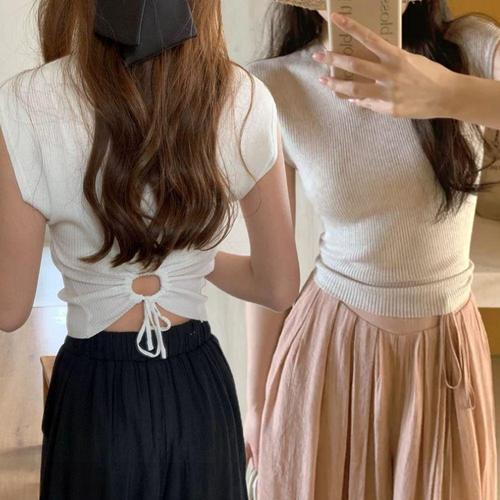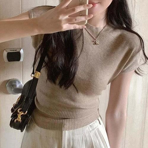 [셀럽하우스]여성 AYII4707 봄 여름 니트 뒤 골지 반팔 데일리 뒷 트임 티