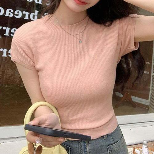 [셀럽하우스]핑크 MIVP2228 베이직 트임 티 셔츠 여름 니트 뒤 반팔