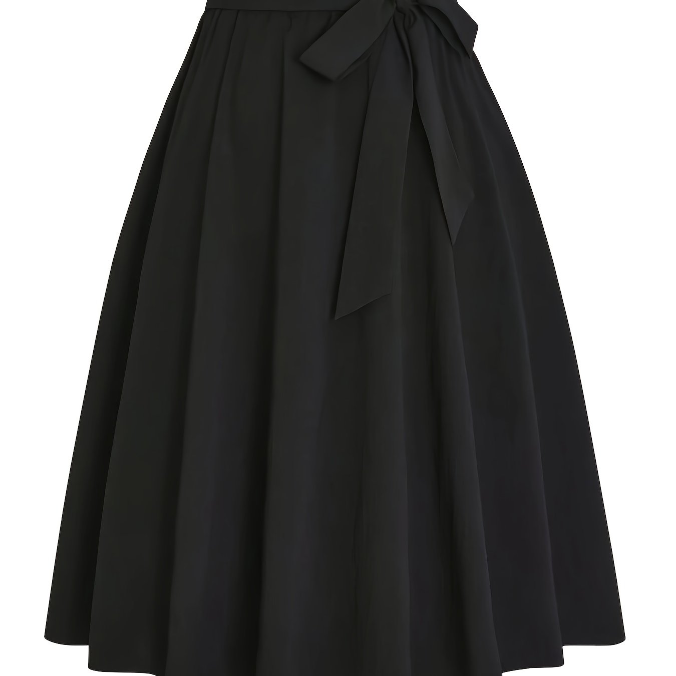 TEMU 플러스 사이즈 - 플러스 사이즈 - 우아한 플러스 사이즈 블랙 미디 스커트, 탄력 있는 허리밴드 & 리본 디테일 - 플레어 디자인, 비신축성 원단, 사계절용 여성용 캐주얼 또는 정장용 스커트, 다용도 패션 | 플레어 스커트 | 비신축성 원단