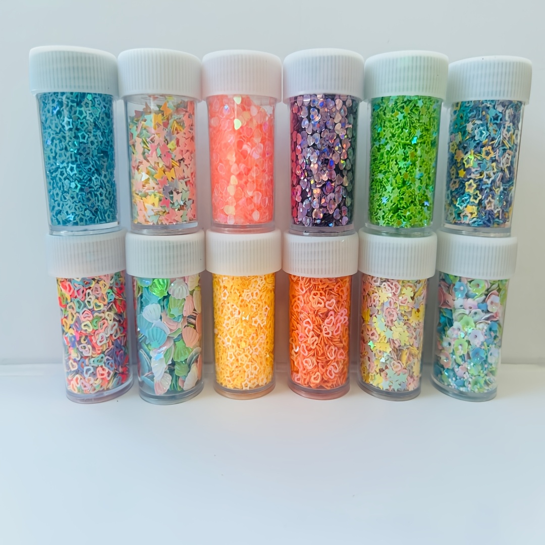 TEMU 12병 반짝이 PVC 글리터 시퀸 공예 장식 - 별, 하트, 꽃 모양 뚜껑 포함 DIY 카드, 네일 아트, 스크랩북용 공예 소품