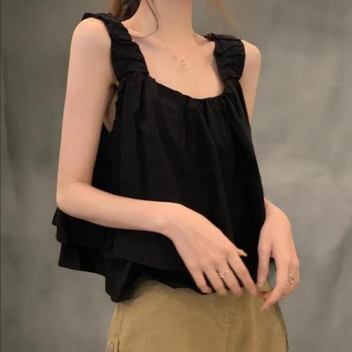 [신상오픈런]여성용 사랑스러운 이중 프릴 A라인 크롭 민소매 탑 (39101576)