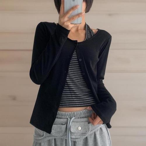 [신상오픈런]여성 홀터넥 크롭탑 라운드넥 슬림핏 긴팔 가디건 세트 (40946761)