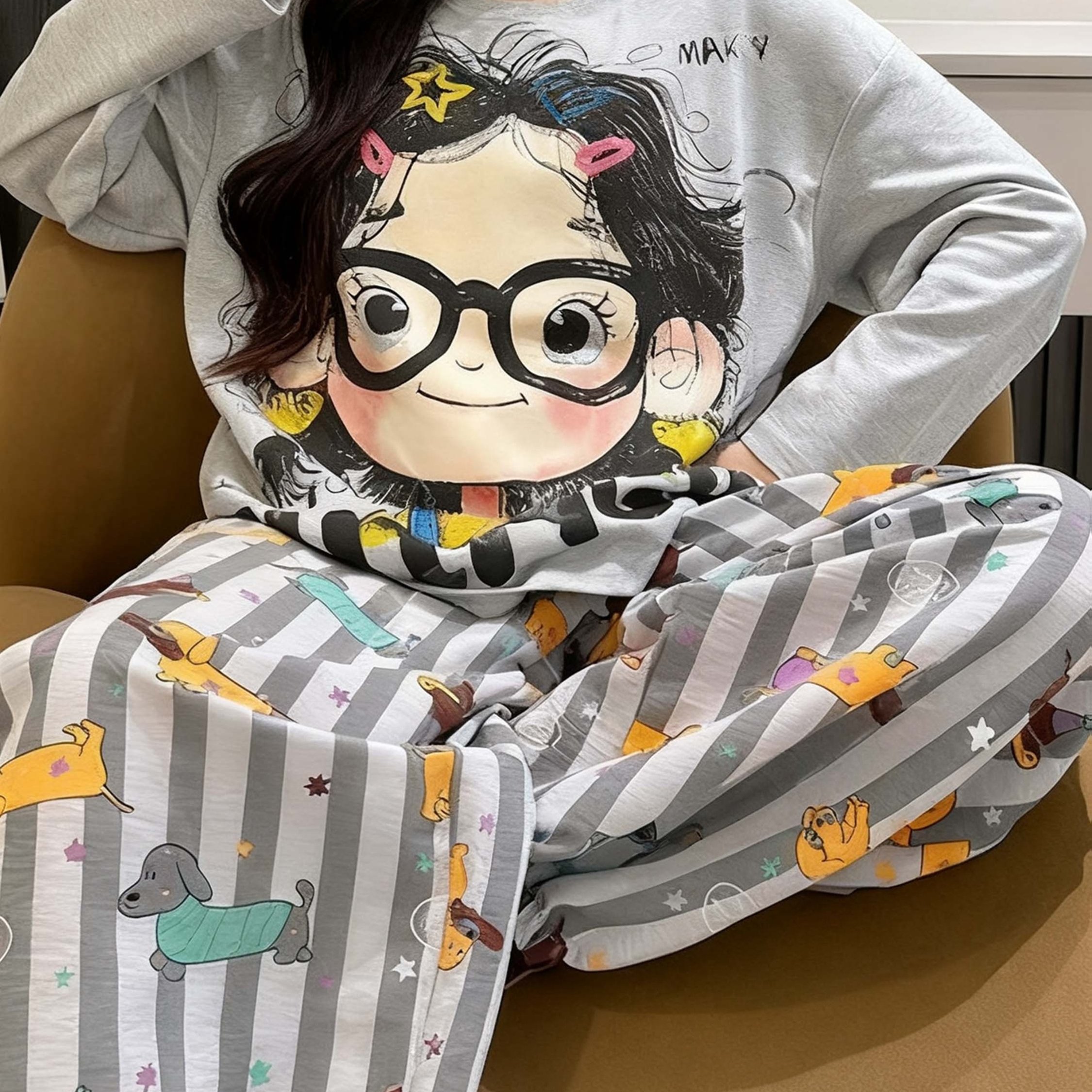 2025 가을 신상 홈웨어 여성 코튼 파자마 세트 귀여운 만화 프린트 잠옷 고급 셔츠 바지 여자친구 선물 라운지웨어