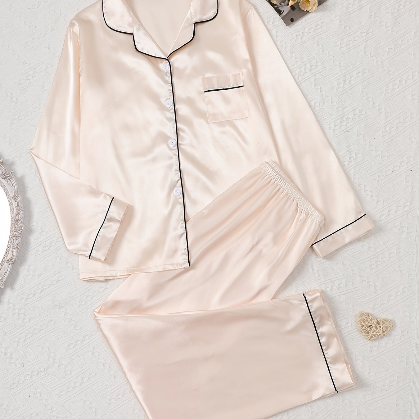 TEMU 여성용 고급 새틴 파자마 세트 - 부드러운 반팔 버튼업 탑 & 신축성 허리밴드 팬츠, 편안한 단색 잠옷, 칼라, 캐주얼|반팔
