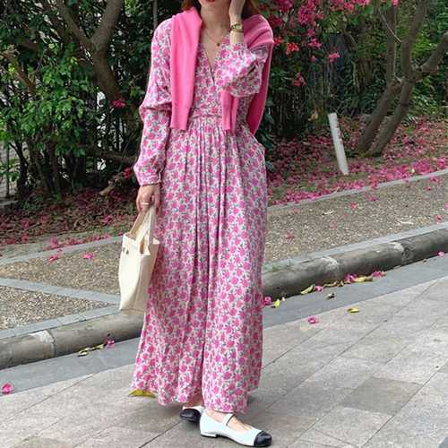 슈팅스타 / 플로럴 패턴 딥브이넥 포켓포인트 롱 원피스