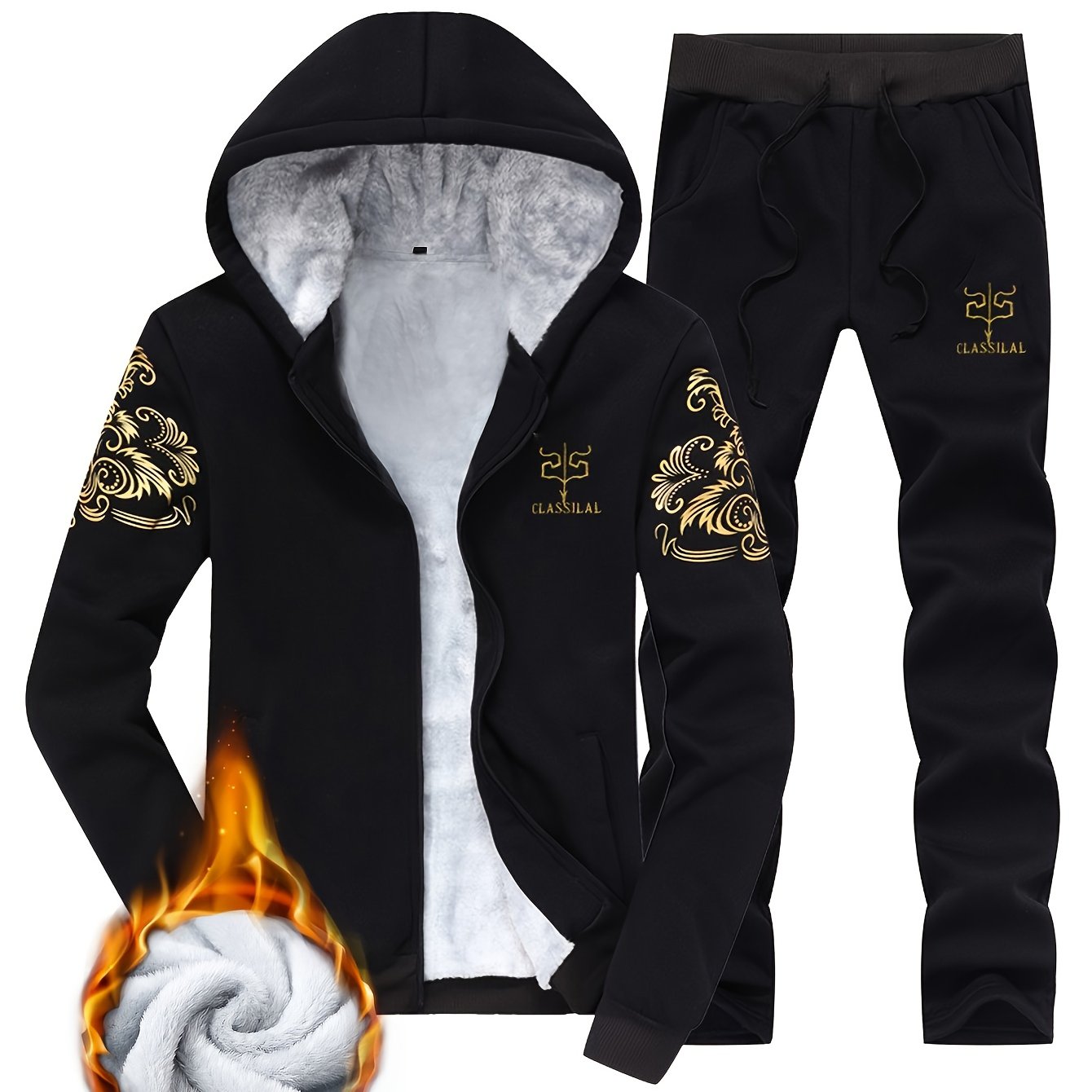 TEMU 남성 겨울 스포츠웨어 세트 - 풀 지퍼 후드 재킷 & 골드 액센트 조거 팬츠, 보온 단열 운동복 (헬스, 러닝용)