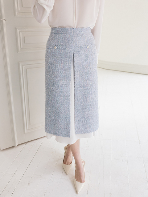 [비에이유 바이 브라이드앤유] 리오린 앞트임 트위드 롱 스커트 (Light blue/Black)