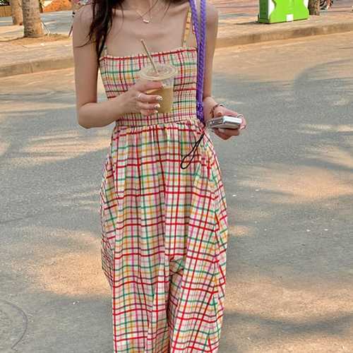 [신상오픈런]여성 체크 무늬 뷔스티에 A라인 긴 나시 원피스 (35333419)