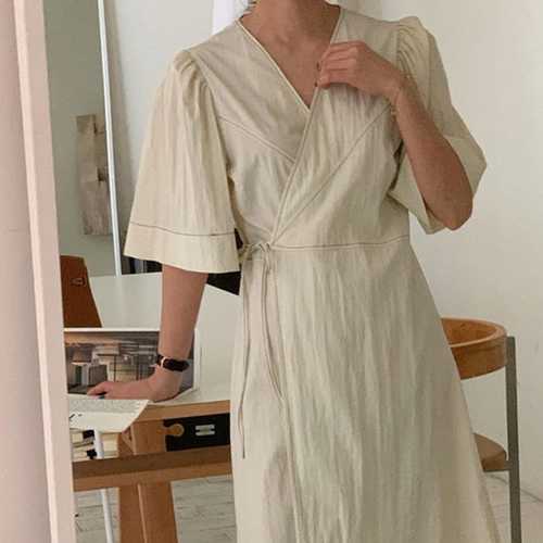 슈팅스타 / 브이넥 퍼프소매 랩 스커트 모던 단정 반팔 원피스