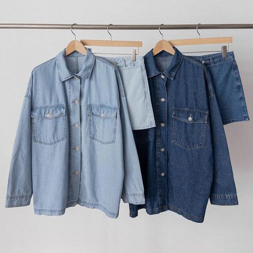 [다잇템_패션]여자 주머니 큐롯팬츠 랩 박시핏 진셔츠 세트