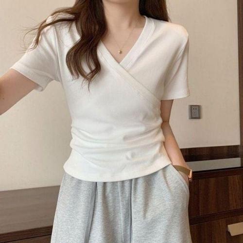 [에이치플러스몰]V넥 데일리 추천 티셔츠 무지 꾸안꾸 셔링 스판 랩 반