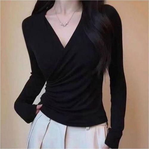 여성 엑스형태 랩티셔츠 슬림핏 골지 니트 V넥 긴팔 골지니트