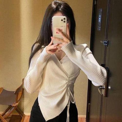[에이치플러스몰]랩스타일 브이넥 슬림 부드러운 스트링 니트티 가디건 니트 티 여성 꽈베기 라운드 가을..