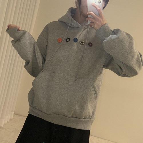 [옷자락] 여자 러블리 꽃단추 겨울 기모후드티 오버핏 티셔츠