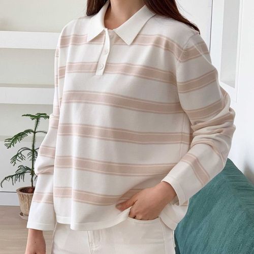 플러리싱 / 러블리 배색 단가라 카라넥 니트 긴팔티 플러리싱