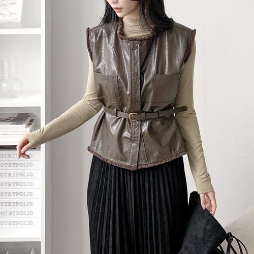 [신상오픈런]여성 가죽 자켓 수술 포켓 벨트 버튼 목폴라 세트 (41503009)